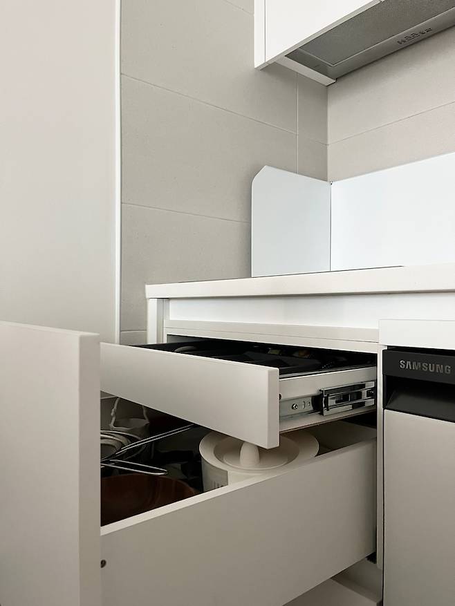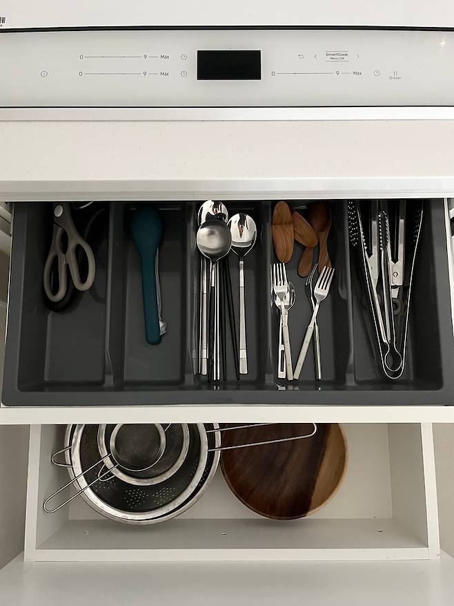 인덕션 아래 서랍은 이중으로 되어 있어서 요리할 때 필요한 조리도구를 빼서 쓰기 편해요.