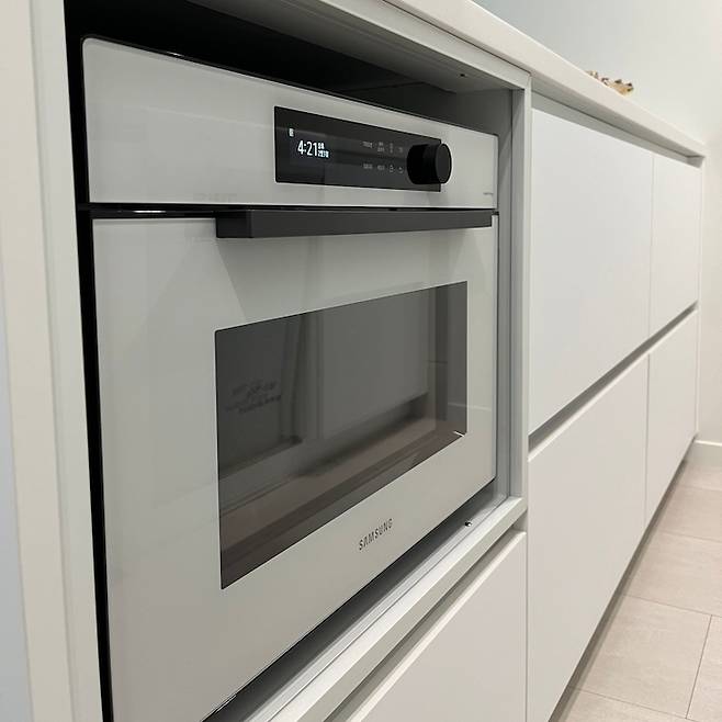 아일랜드 끝부분 한 칸만 삼성 직화오븐 사이즈에 맞추어 공간을 비웠는데요, 요 직화오븐은 전자레인지, 에어프라이어, 오븐 역할을 모두 하여서 별도의 다른 가전들이 필요하지 않아서 좋더라고요.