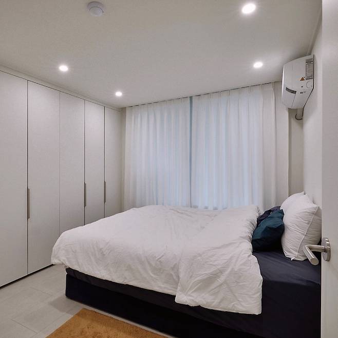 침실은 제가 힘을 많이 뺀 곳 중 하나입니다. 기존 집주인분이 쓰던 붙박이장이 거의 새것이라 그대로 활용하기로 하여 필름 작업만 했고, 침대는 가로 1800의 라지 킹사이즈의 큰 침대를 두었습니다.