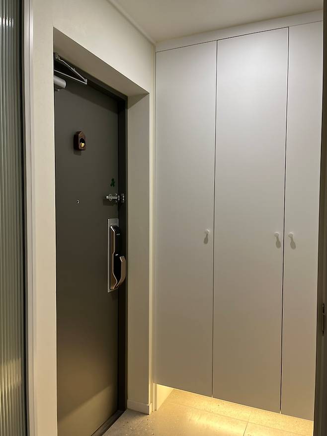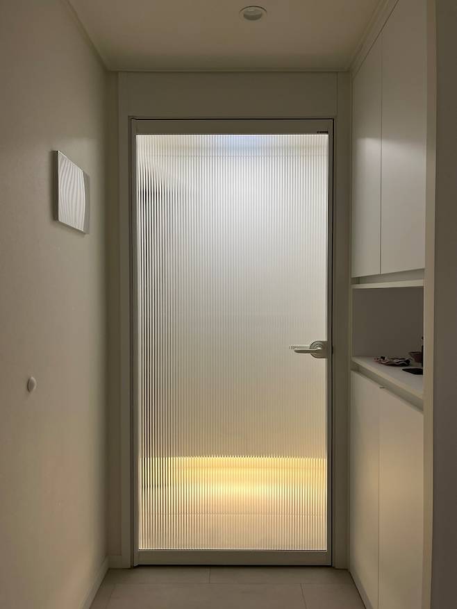 복도식 아파트인지라 중문을 설치했는데, 설치하길 아주 잘 했다고 생각하는 요소 중 하나입니다. 중문의 유무에 따라 외풍이 들어오는 정도 차이가 엄청 크더라고요. 중문은 영림도어(YS01D)고, 전체가 모루 유리로 들어간 형태로 골랐습니다.