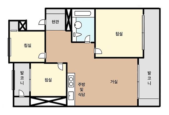 채광이나 뷰가 기가 막히게 좋은 집은 아니었지만, 복도식 아파트지만 한 층에 집이 많지 않고, 끝 집이라 작은방들의 창문이 복도를 향해 나 있지 않다는 점, 흔한 복도식 20평대 2bay 구조와 조금 다르게 현관문을 열자마자 긴 일자 복도와 안방이 보이는 구조가 아니라는 점에 끌렸습니다.