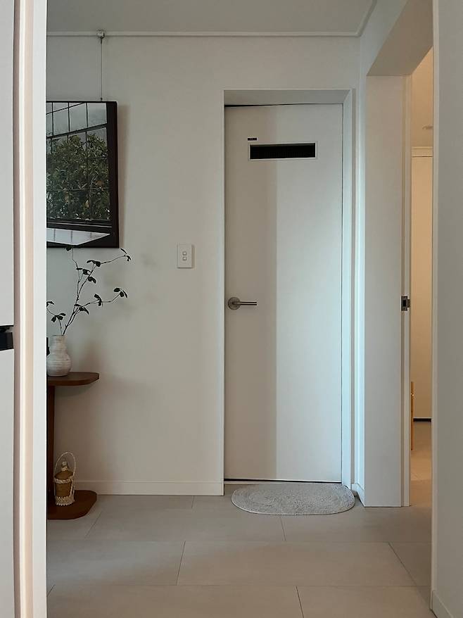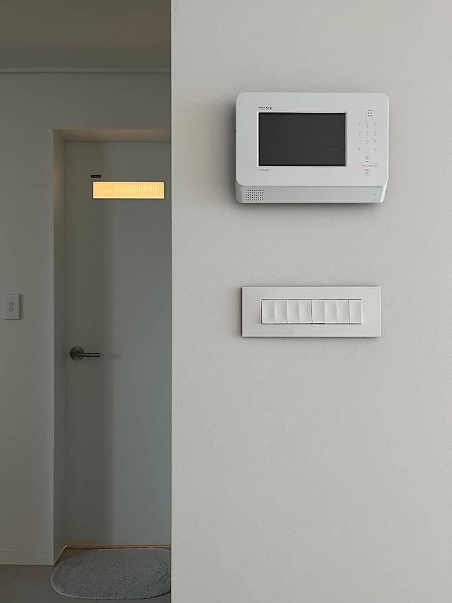 조금 멀리서 화장실 문도 함께 담기게 찍어보았어요. 거실을 제외한 다른 곳은 모두 르그랑 엑셀 스위치를 사용하고 있습니다. 엑셀도 심플하고 참 예뻐요. tmi 하나만 풀자면 인터폰은 훨씬 저렴하고 예쁜 것들도 많은데, 저희 아파트는 반드시 지정된 브랜드 것만 할 수 있다고 해서 조~금 아쉽네요.