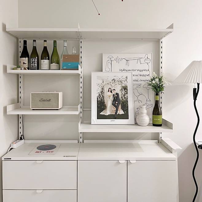 저희 집 현관에서 중문을 열고 들어오면 정면으로 보이는 방이 이 방인데요, 저희 집에 방문했을 때 처음 마주하는 모습이 예뻤으면 좋겠다고 생각하여 이 자리에 선반을 배치했습니다.