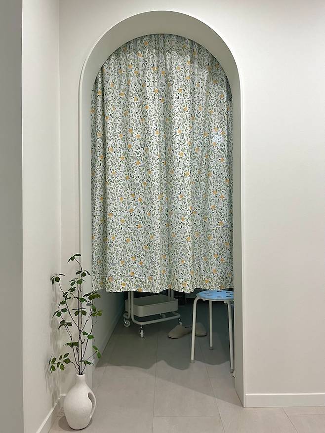 아치문에는 계절별로 패브릭을 바꿔 달아주어 소소하게 무드를 바꿔주고 있습니다. 봄여름에는 상큼하게, 가을 겨울에는 크리스마스 무드로, 요즘에는 스트라이프가 예뻐 보여 차분한 무드로!