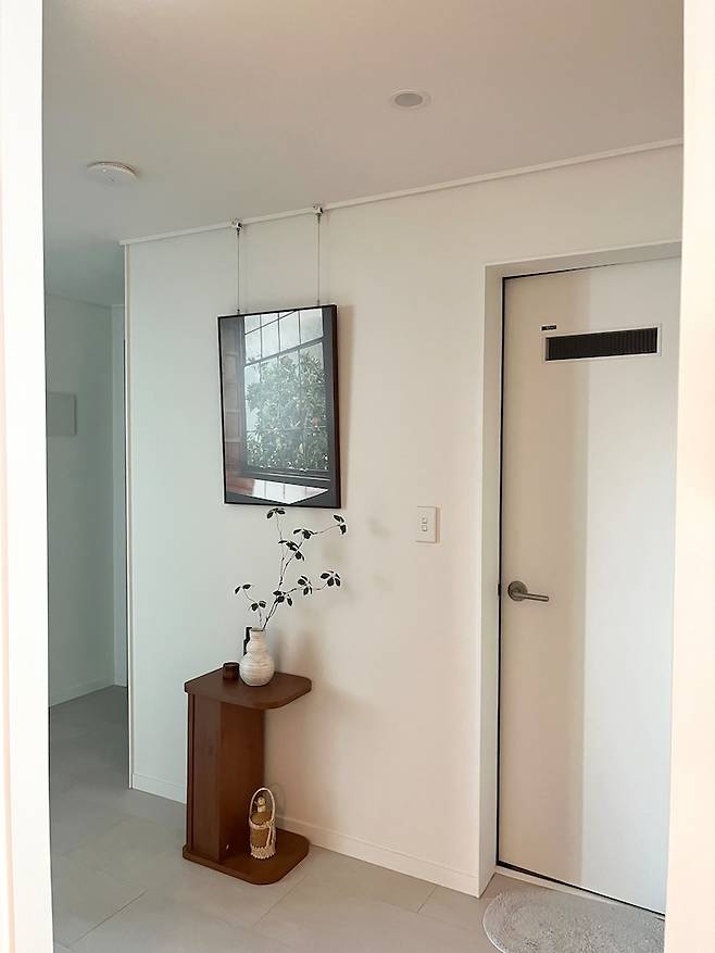 붙박이장의 옆면은 가벽을 쳐서 화장실 벽면이 하나로 쭉 연결된 것처럼 만들었습니다. 이 복도 공간에는 전신거울도 배치해보고, 액자도 배치해보는 등 다양하게 활용해보고 있어요. 벽난로 콘솔도 잘 어울릴 것 같고, 수납이 부족하면 슬림한 수납장을 놓아도 될 것 같은 공간이라, 앞으로도 계속 변화할 것 같습니다.