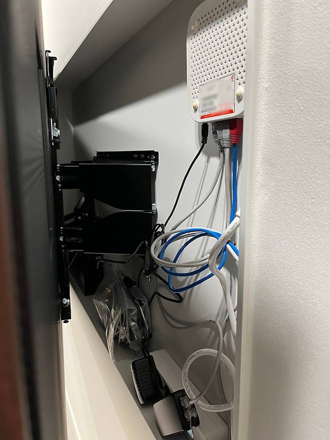 안 그래도 좁은 거실, 더 좁아 보일까 걱정도 했지만, 막상 하고 나니 큰 차이는 없는 것 같고 TV 부속품들이 깔끔하게 정리되어 좋습니다. 정면에서 쳐다본 저희 집 TV 벽면, 깔끔하죠?