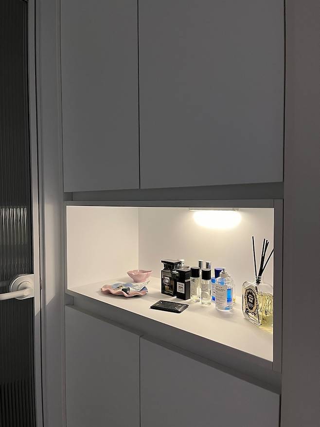 중문 옆 빈 공간에는 붙박이장을 설치하고 중간을 오픈시켜 향수나 반지 등을 둘 수 있도록 했고, 전기가 연결된 곳이 아니라 건전지를 넣는 센서등을 안쪽에 부착해두었습니다.