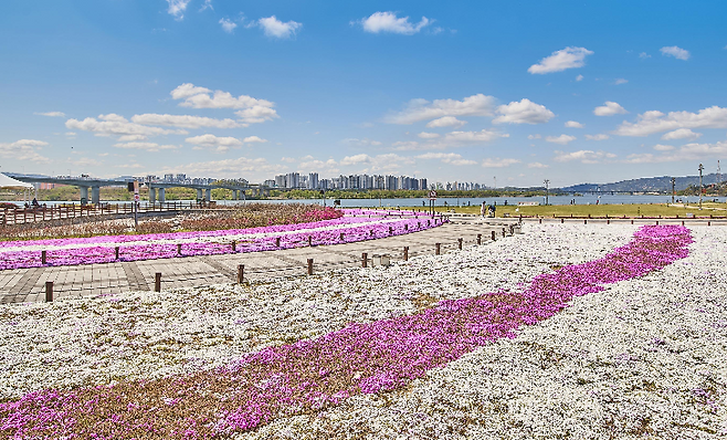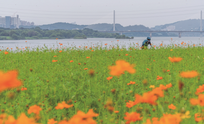 ▶ 특징: 자작나무 숲과 사계절 꽃밭이 조성된 수변 공원. 특히 5~6월 수레국화가 만개해 파란 꽃밭과 한강 풍경이 어우러짐. 인라인 스케이트장, 자전거공원, 레고 어린이 정원 등 다양한 시설로 가족 나들이에 적합.