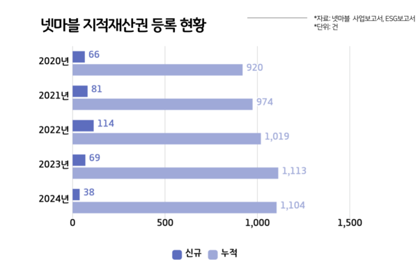 10일 넷마블의 지속가능경영보고서에 따르면 회사의 연도별 신규 IP 등록건수는 △2020년 66건 △2021년 81건 △2022년 114건 △2023년 69건 △2024년 38건이다. 2022년을 기점으로 뚜렷한 감소 흐름을 나타낸다.