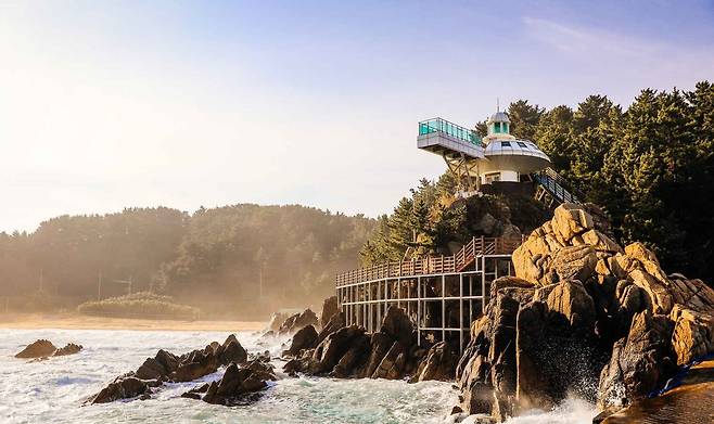 정자에서 조금만 더 걸으면 새하얀 하조대 무인등대, 공식 명칭 ‘기사문 등대’가 등장한다. 1962년에 설치된 이 등대는 20km까지 빛을 전달하며 지금도 동해를 비추고 있다. 기암절벽 위 등대와 송림은 마치 동화 속 한 장면처럼 방문객의 발길을 붙잡는다.