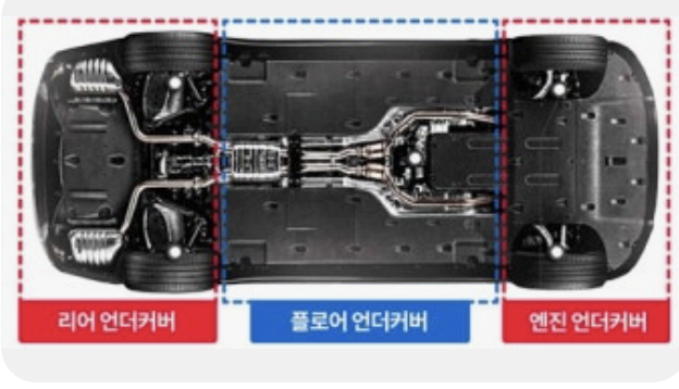 2. '소음'을 막는 '방음벽': 고속으로 주행할 때, 차체 하부에서 "쉬익-"하는 시끄러운 바람 소리(풍절음)를 들어보신 적 있으시죠? 언더커버는, 이 하부에서 발생하는 공기 마찰 소음과 노면 소음이 실내로 유입되는 것을 막아주는 '방음벽' 역할도 함께 수행하여, 실내를 더 조용하고 쾌적하게 만들어 줍니다.