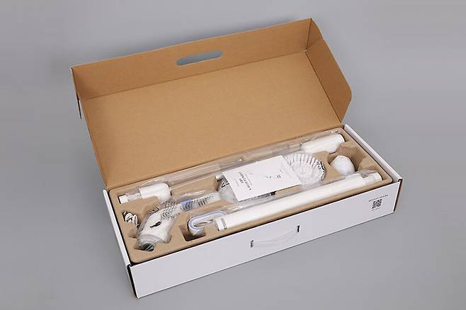 오엘라 뉴 네오스핀 욕실청소기 OA-NS03은 제법 큼직한 박스에 담겨 있다. 박스 안에는 구성품을 고정하면서 완충 효과까지 제공하는 펄프 몰드를 사용하고 있다.