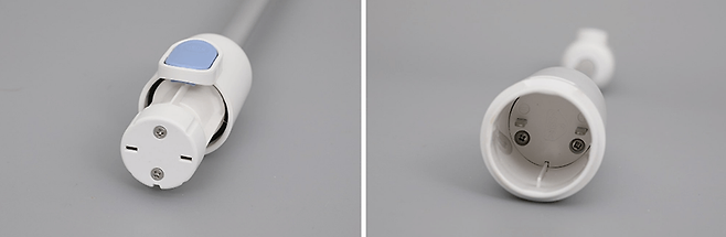 연장 파이프의 한쪽 끝에는 손잡이 파트와 마찬가지로 푸른색 타원형의 분리 버튼이 있으며, 두 개의 납작한 연결 단자도 동일하게 갖추고 있다. 반대편 끝부분을 보면 납작한 연결 단자에 들어가는 두 개의 금속핀이 돌출되어 있는 것을 확인할 수 있다.