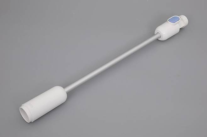 오엘라 뉴 네오스핀 욕실청소기 OA-NS03의 구성품 중 손잡이 파트만큼 긴 또 하나의 부품은 연장 파이프로, 양 끝부분의 플라스틱 연결부 사이가 얇은 금속 봉으로 이어져 있다.
