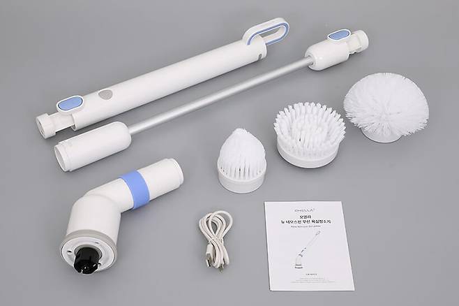 구성품으로는 손잡이가 달려 있는 부분과 연장 파이프, 모터부, 세 가지 종류의 브러시, 충전용 USB 케이블, 그리고 사용 설명서가 제공된다.