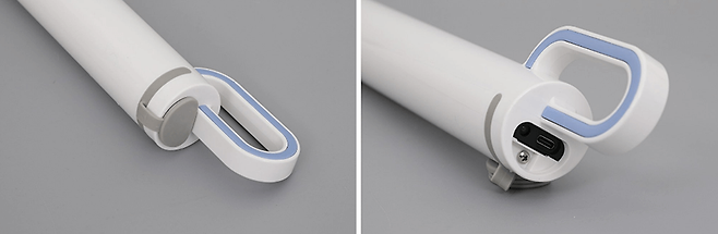 손잡이 아래쪽에는 회색으로 된 두툼한 커버가 씌워져 있는데, 커버를 열어보면 안쪽에 충전용 포트와 LED 충전 표시등이 보인다. 충전 포트의 규격은 USB C타입을 채택하고 있다.