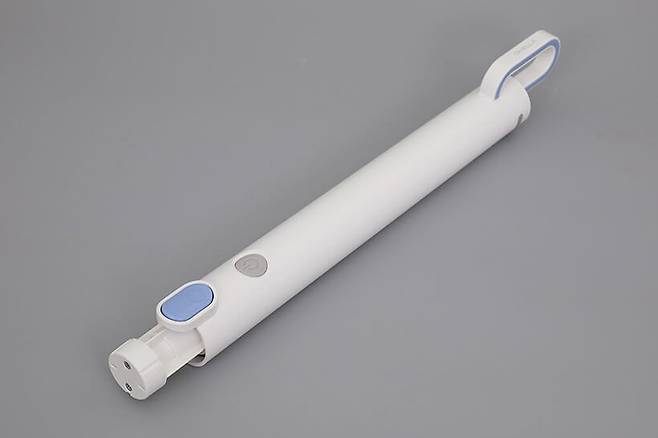 흰색 원통형으로 된 손잡이 파트는 제일 위쪽에 타원형 손잡이가 달려 있으며, 반대쪽 끝 가까이에는 회색의 원형 전원 버튼과 푸른색의 타원형 분리 버튼이 자리 잡고 있다.