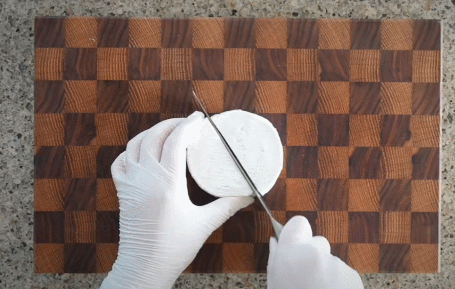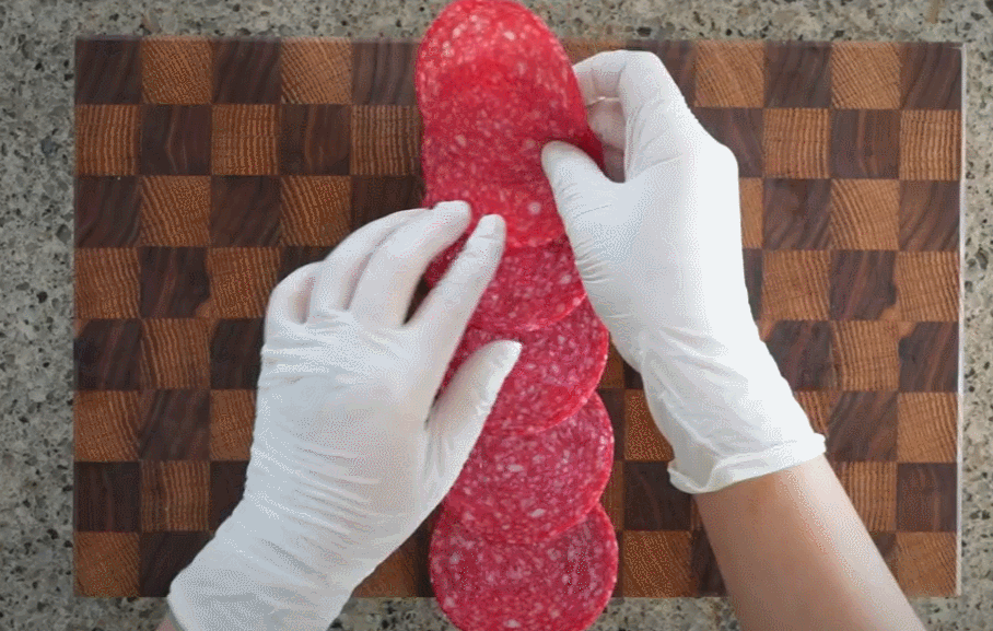 3. 살라미는 돌돌 말아서 꽃 모양으로 만들어줍니다. 여러 개의 살라미를 이어서 돌려준 다음, 반으로 잘라서 꽃처럼 보이게 모양을 잡아줍니다.