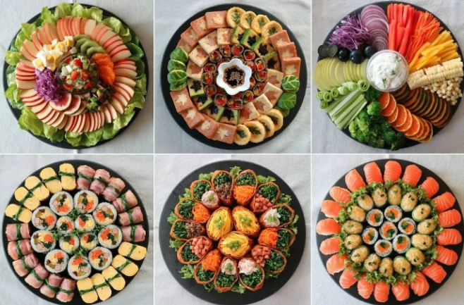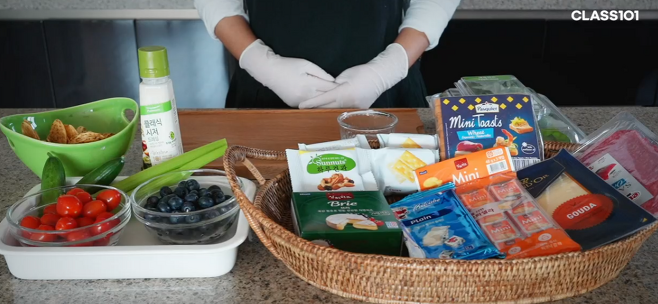 준비물: 블루베리, 방울토마토, 미니오이, 샐러리, 나쵸칩, 견과류, 참크래커, 치즈, 살라미, 허브잎 등