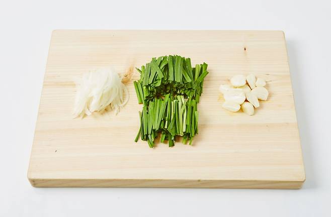 1. 양파는 곱게 채 썰고, 부추는 5㎝ 길이로 썰고, 마늘은 2등분한다.