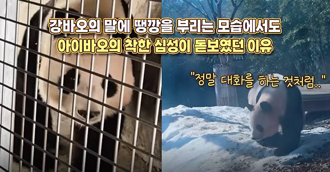 이날 아이바오와 강바오의 모습은 유독 인상적이었습니다. 모두 말을 알아듣는 것도 놀라웠지만 마치 진짜 부녀 간의 티격태격하는 순간처럼 보였습니다. 처음에는 투정을 부리며 심통을 내다가도, 결국 강바오의 부탁을 뿌리치지 못하고 도와주려는 아이바오의 모습에서 다정한 성격과 깊은 애정을 다시금 확인할 수 있었습니다. 결국 아무리 투정을 부려도, 아이바오의 착한 심성은 감출 수 없었습니다.