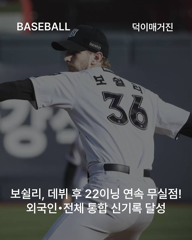 6회초 연속 안타를 허용하며 2실점을 기록해 무실점 행진은 멈췄지만, 이미 신기록 달성은 이뤄진 뒤였습니다. 보쉴리는 이날까지 데뷔 후 22이닝 연속 무실점을 기록하며 KBO리그 역대 최장 기록을 세웠습니다.