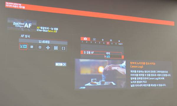 황종환 매니저는 이 같은 캐논 카메라의 최신 기술 중에 2가지를 강조했다. 동영상 카메라의 시초라 할 수 있는 캐논 오두막(5D Mark II) 시절만 하더라도 영상 촬영 중에 인물에게 정확하게 포커스(초점)을 맞추기 위해 카메라 옆에서 수동으로 렌즈 포커스 링을 돌리는 포커스 풀러가 필요했지만 이제는 사용자가 원하는 피사체에 정확히 초점을 맞추고 움직임까지 추적하는 '듀얼 픽셀 AF' 기능이 들어간다.
