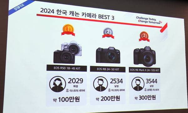 지난 해 국내 시장에서 가장 많이 팔린 캐논 카메라 베스트 3 모델로는 20대 여성들이 가장 많이 선택한 100만원대 EOS R10 18-45 렌즈킷, 2030 남성들이 선호하는 200만원대 EOS R8 24-50 렌즈킷, 그리고 300만원대 가격으로 3040 남성들이 가장 많은 비중을 차지한 EOS R6 Mark II 24-105 렌즈킷을 꼽았다.
