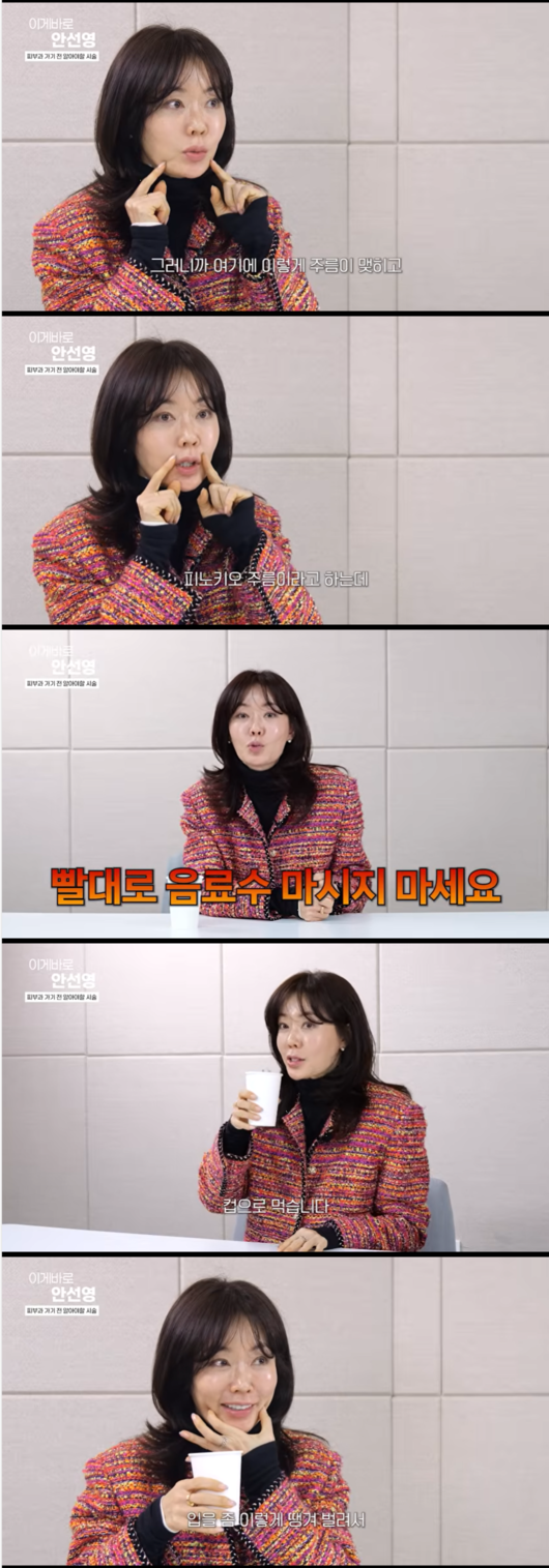 그녀가 꼽은 하관 노화의 주범은 다름 아닌 '빨대'였다. 안선영은 "빨대로 음료수 마시지 마라. 노화를 완전히 일으킨다"며 "입처럼 많이 움직이는 근육은 패일 수밖에 없는데, 빨대를 빨 때의 입 모양이 주름을 유발한다"고 설명했다.
