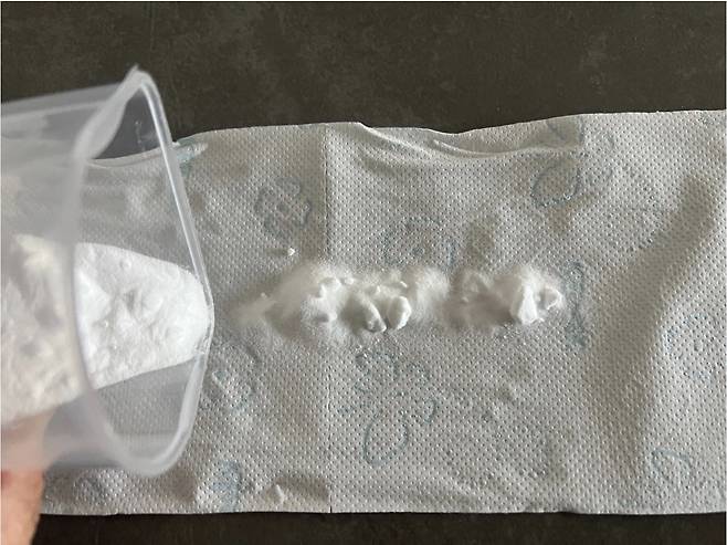 베이킹소다를 중심으로 길게 휴지를 접어주세요