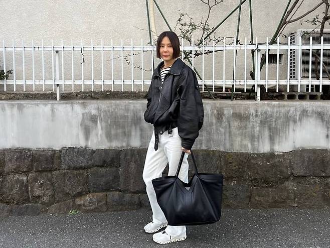 공개된 사진에서 김나영은 클래식한 블랙 레더 아우터에 화이트 팬츠를 매치해 세련된 분위기를 연출했다. 여기에 볼드한 실루엣의 블랙 빅백을 더해 스타일의 완성도를 높였다.