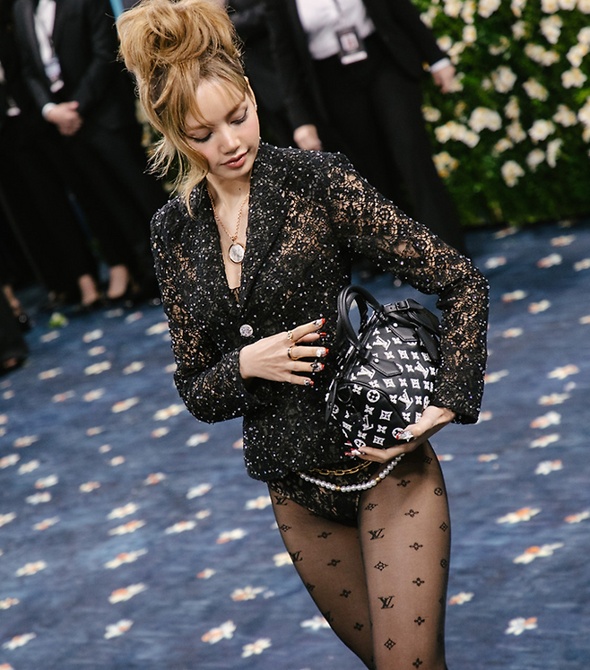 하의는 과감히 생략하고 모노그램 스타킹을 매치한 팬츠리스룩으로 관능적인 매력을 발산하며 월드클래스의 위엄을 뽐냈다.