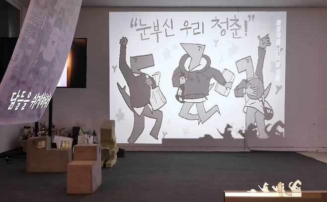 이들은 콘텐츠 제작자들의 경제적인 이유로 단순한 형태를 띤다. 작가는 이번 작업에서 쓰레기 섬에서 집을 얻기 위한 소라게 ‘Krap’과 야맹증을 가졌지만, 밤에 일해야 하는 닭 ’CHICKEN’에 이어 아주 오래전 한반도에 살았던 공룡들의 모습을 상상한 ‘잡룡(JobRyoung)’ 또는 ‘일용’의 이야기를 풀어낸다.