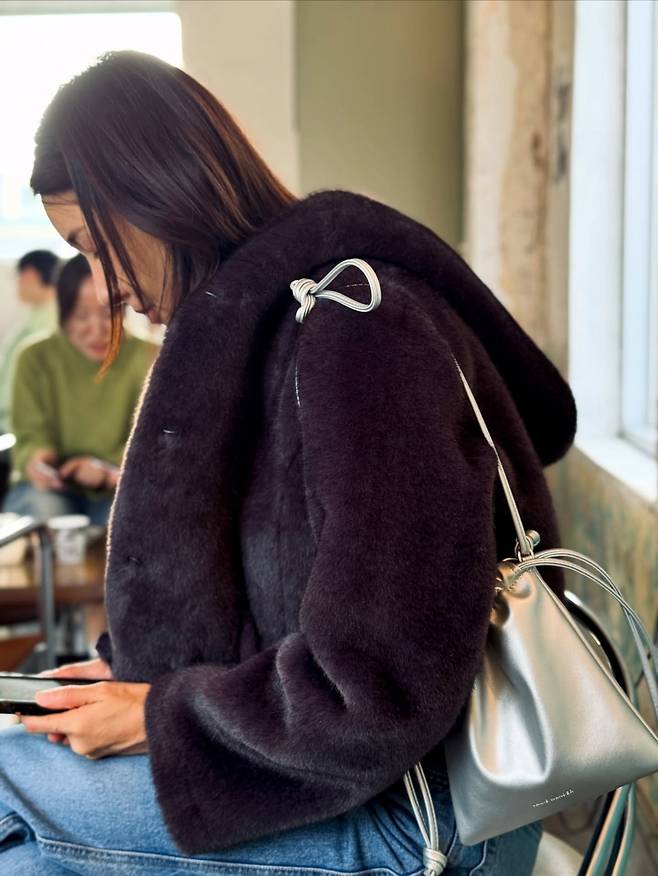 또한 실내 조명 아래에서 드러나는 버건디 브라운 톤의 미세한 컬러감이 고급스러운 질감과 매치되며, 겨울 시즌 아우터 스타일과도 자연스럽게 어울리고 있었어요.