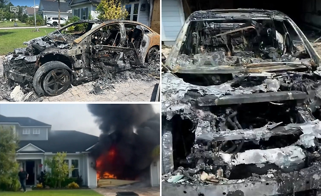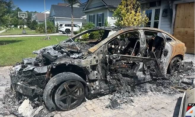 미국 플로리다 한 주택의 차고에서 벤츠 EQE 350+가 화염에 휩싸인 후 잿더미로 발견됐다.
