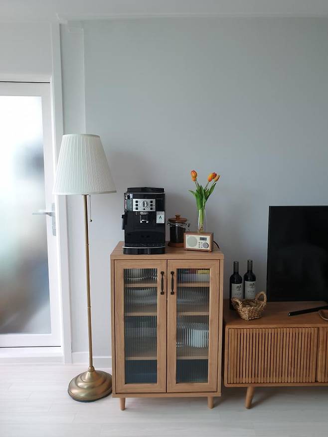 거실의 한쪽 먼저 소개할게요. 거실장과 홈 카페장이 있어요. 가구는 최대한 톤을 맞춰주었어요.