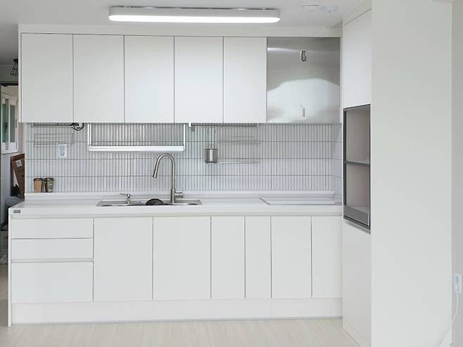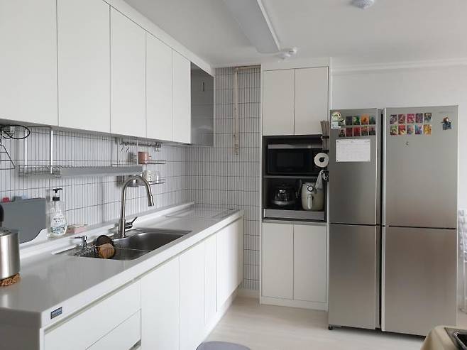 공사 직후 주방입니다. 상부장 없는 주방을 꿈꿨지만 여러 이유로 포기했어요. 그래도 화이트만은 포기할 수 없었어요.