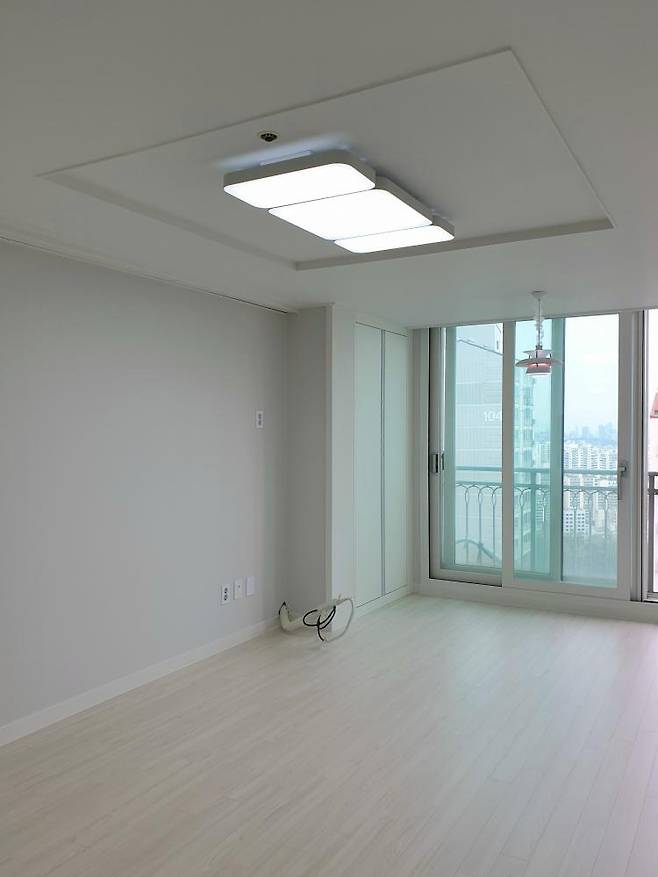 벽지는 연그레이고 마루는 화이트로 골랐습니다. 공사 직후 거실입니다. 체리색이 완벽하게 사라졌어요! 속 시원하시죠 ㅎㅎ고층이라 해가 잘 드는 데, 이전보다 훨씬 환해 보여요.