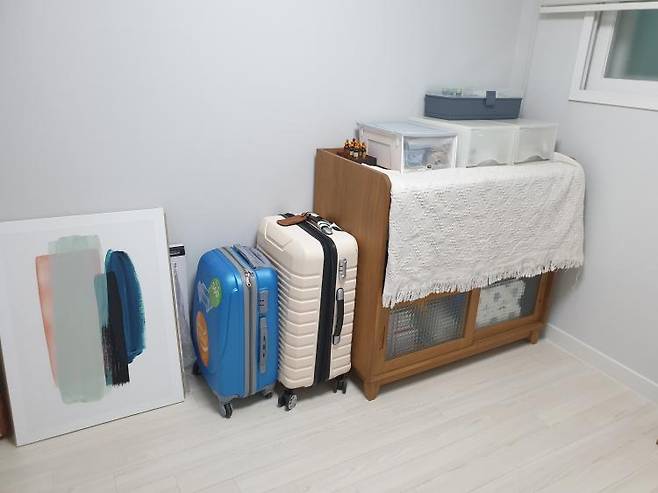 쌓아둔 짐이 보기 싫어서 블랭킷으로 가려뒀어요. 조만간 딱 맞는 가리개를 찾아보려고 해요. 자리 못 찾은 그림까지 잡동사니는 다 이 방에 있네요.