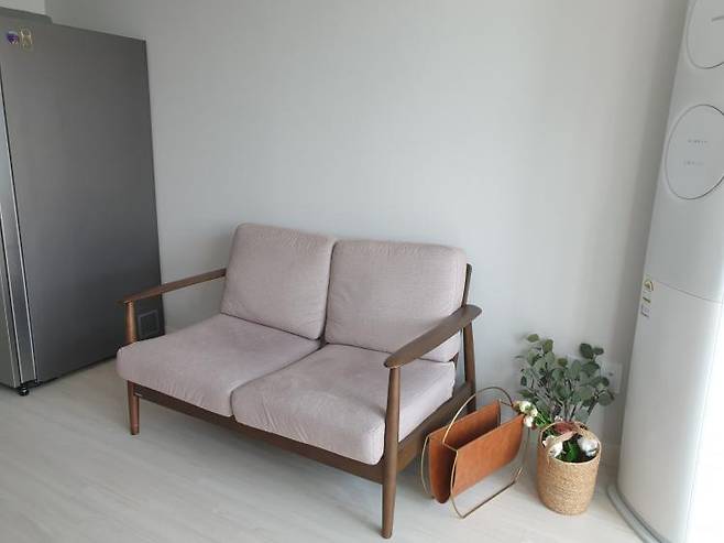 거실 반대쪽에는 소파와 에어컨이 있어요. 전부터 쓰던 2인용 소파는 공간이 많이 남아서 허전해 겸사겸사 3인용 소파를 살까 생각 중이에요.
