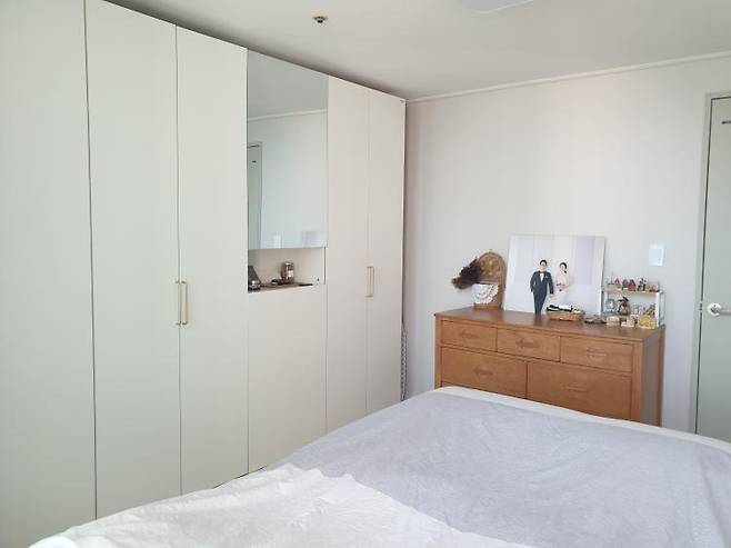 안방은 심플하게 침대, 옷장, 수납장이 있습니다. 기존에 쓰던 가구들인데 각각 다른 위치에 흩어져 있던 지라 살짝 안 맞는 듯해도 보다 보면 조화로워요.