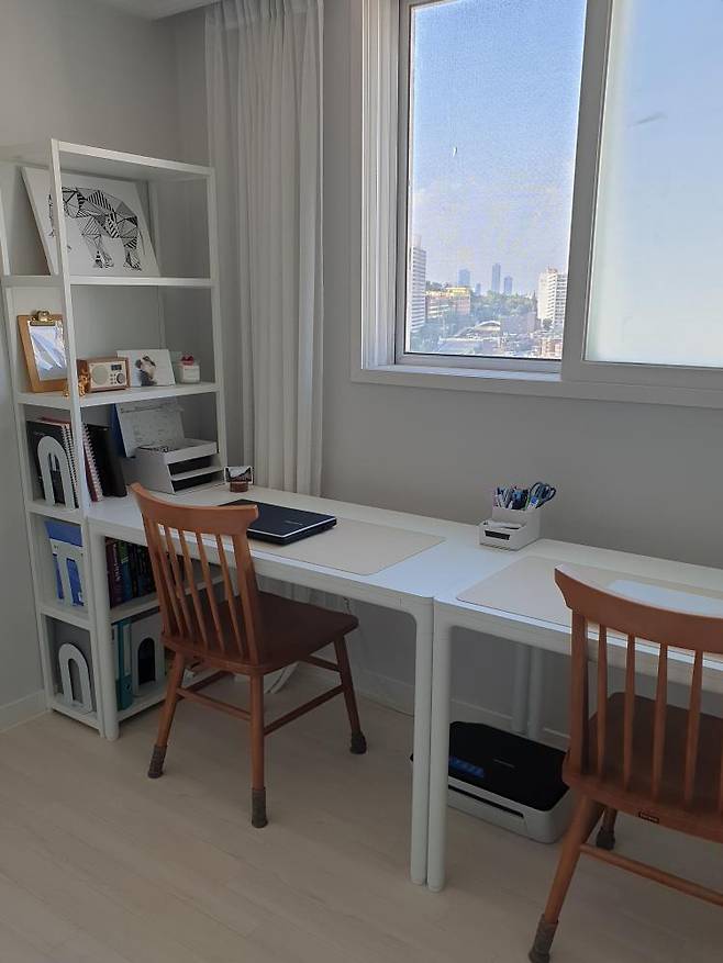 방 1개 시절, 제가 제일 갖고 싶었던 서재를 드디어 만들었습니다. 서재도 깔끔하게 화이트 가구로 들였어요. 한쪽에는 일렬로 책상과 책장을 두었어요.