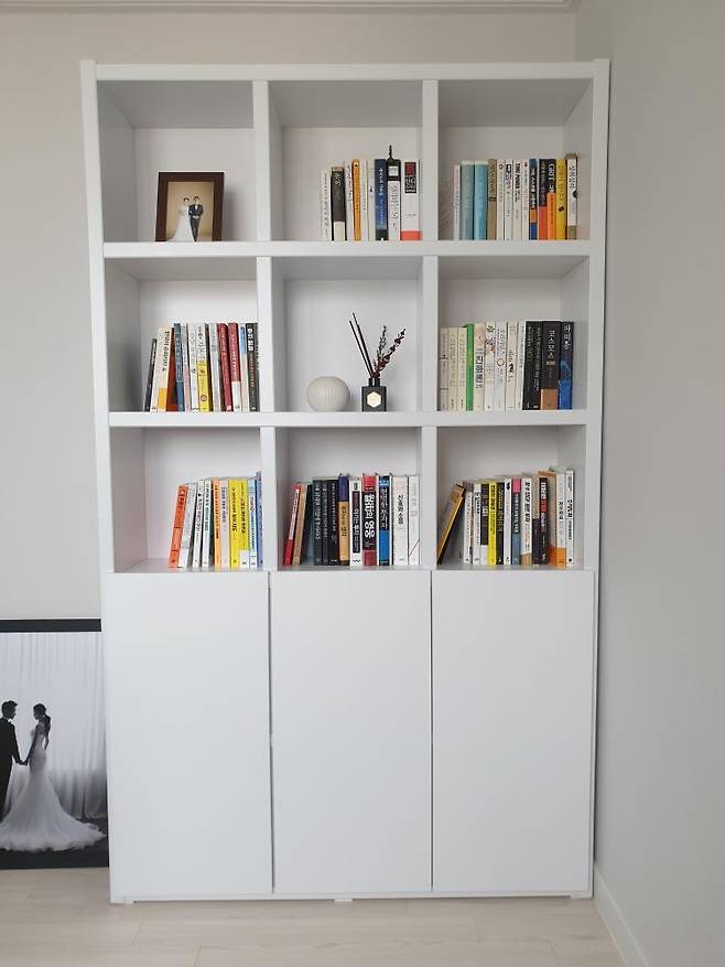 반대편에는 수납 짱짱한 도어형 책장을 사서 보기 싫은 것들은 도어 안에 숨겼어요.