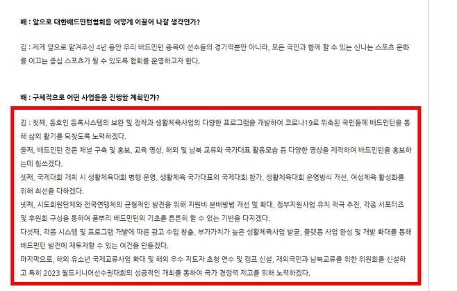그는 2021년 31대 회장 당선 당시 "시대의 흐름에 맞도록 경기력에 앞서 보호되어야 할 선수들의 인권, 공정한 경기 운영 및 선수 선발 등을 검토할 계획입니다."라는 발언을 한바, 안세영 선수의 폭탄 발언에 큰위기를 맞이했습니다.