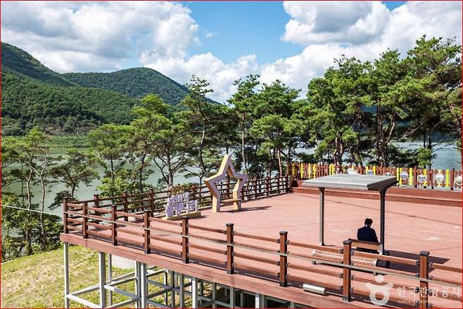 출렁다리 끝 지점에는 간식점, 쉼터, 하트 포토존 등이 있어 잠시 쉬어가기 좋습니다. 이후 저희의 목적지는 보현산댐 수변둘레길이었는데요.
