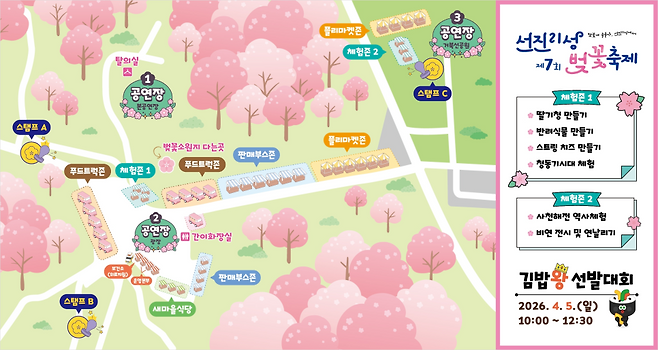 현장에서는 K팝 공연, 연주 무대, 버스킹, 문화 콘서트가 이어지고, 분위기를 한층 살려줍니다. 여기에 김밥왕 선발대회 같은 이색 이벤트도 새롭게 등장하면서, 단순한 꽃구경 이상의 재미를 만들어냅니다.