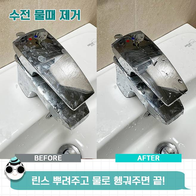 이 스프레이는 수전에 칙칙- 뿌려준 후 물로 닦아주면 OK. 저 같은 경우에는 칫솔로 부드럽게 솔질해주면서 마무리 했답니다.