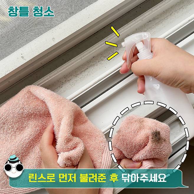 청소의 첫 단계는 때 불려주기인데요. 묵은 때가 잘 벗겨지도록 린스 스프레이를 창틀 곳곳에 칙칙 뿌려주고 잠시 기다려봅니다.