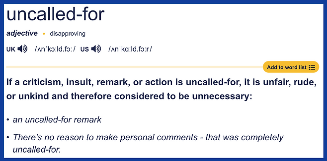 우선 사전적 의미를 한 번 살펴보자. 케임브리지 사전에 따르면, 누군가의 언행이 uncalled for 하다고 말하면, 그 사람의 언행이 필요 이상으로 부당하거나, 무례하거나, 못됐다는 것을 의미해.