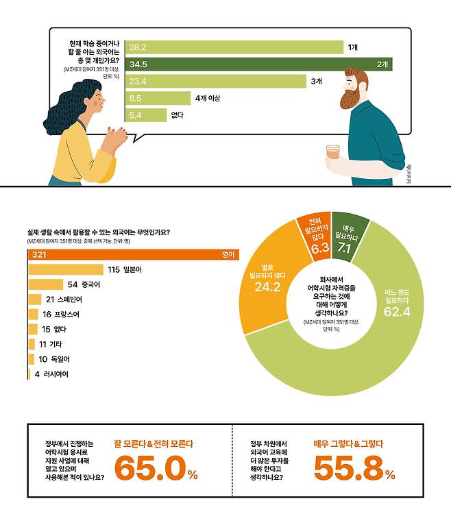 한편 정부 차원에서 외국어 교육에 대한 투자를 더 확대해야 한다는 의견도 많았어요. 55.8%가 ‘외국어 교육에 대한 정부 투자가 더 필요하다’고 답했어요. 특히 외국어 자격증 취득에 많은 비용이 들어가기 때문에 경제적으로 어려운 청년들에게 이러한 지원이 절실하다고 강조했어요.